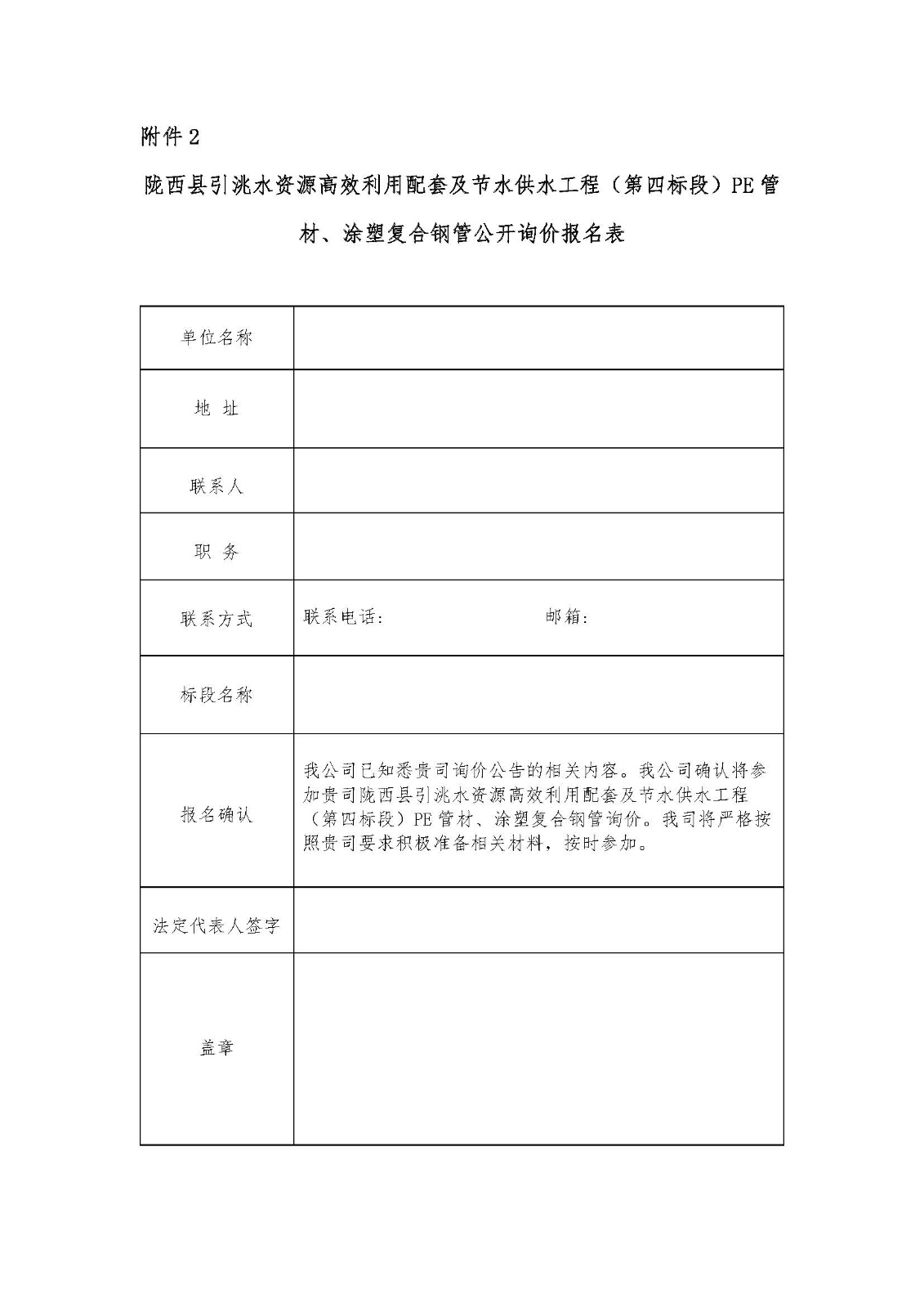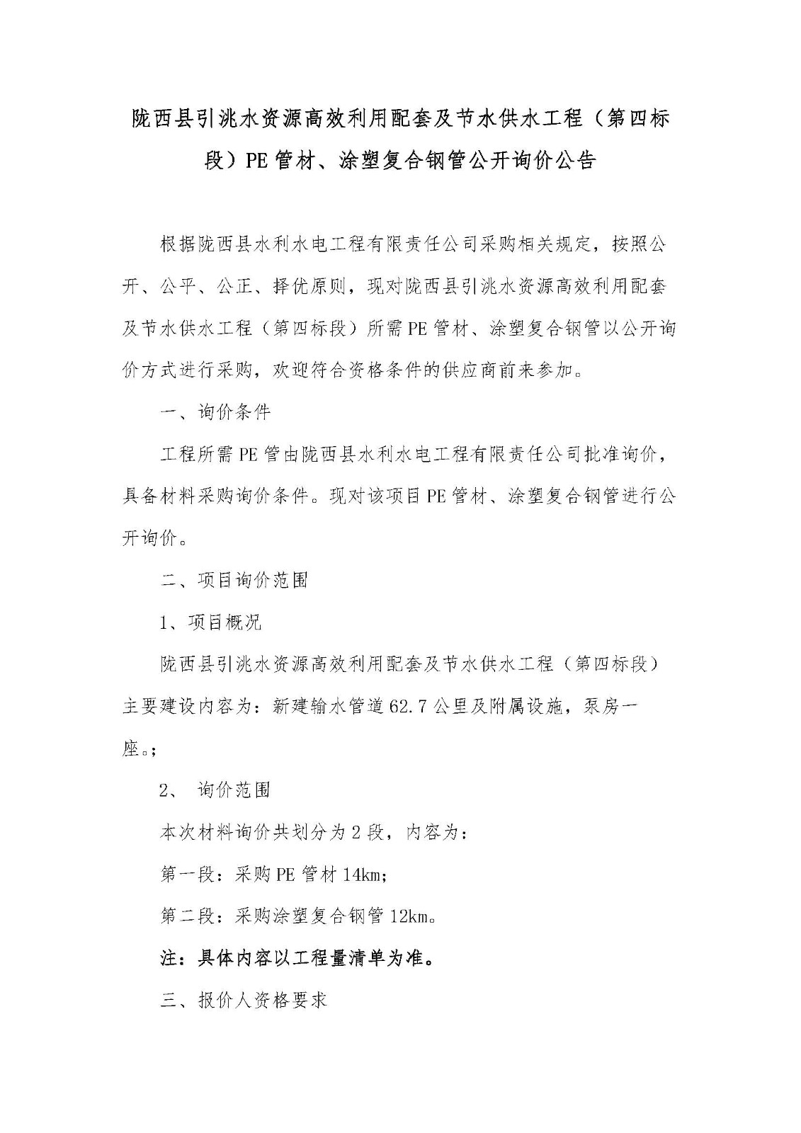 陇西县引洮水资源高效利用配套及节水供水工程(第四标段)PE管材、涂塑复合钢管公开询价公告