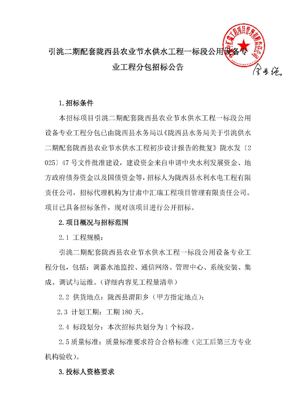 引洮二期配套陇西县农业节水供水工程一标段公用设备专业工程分包招标公告
